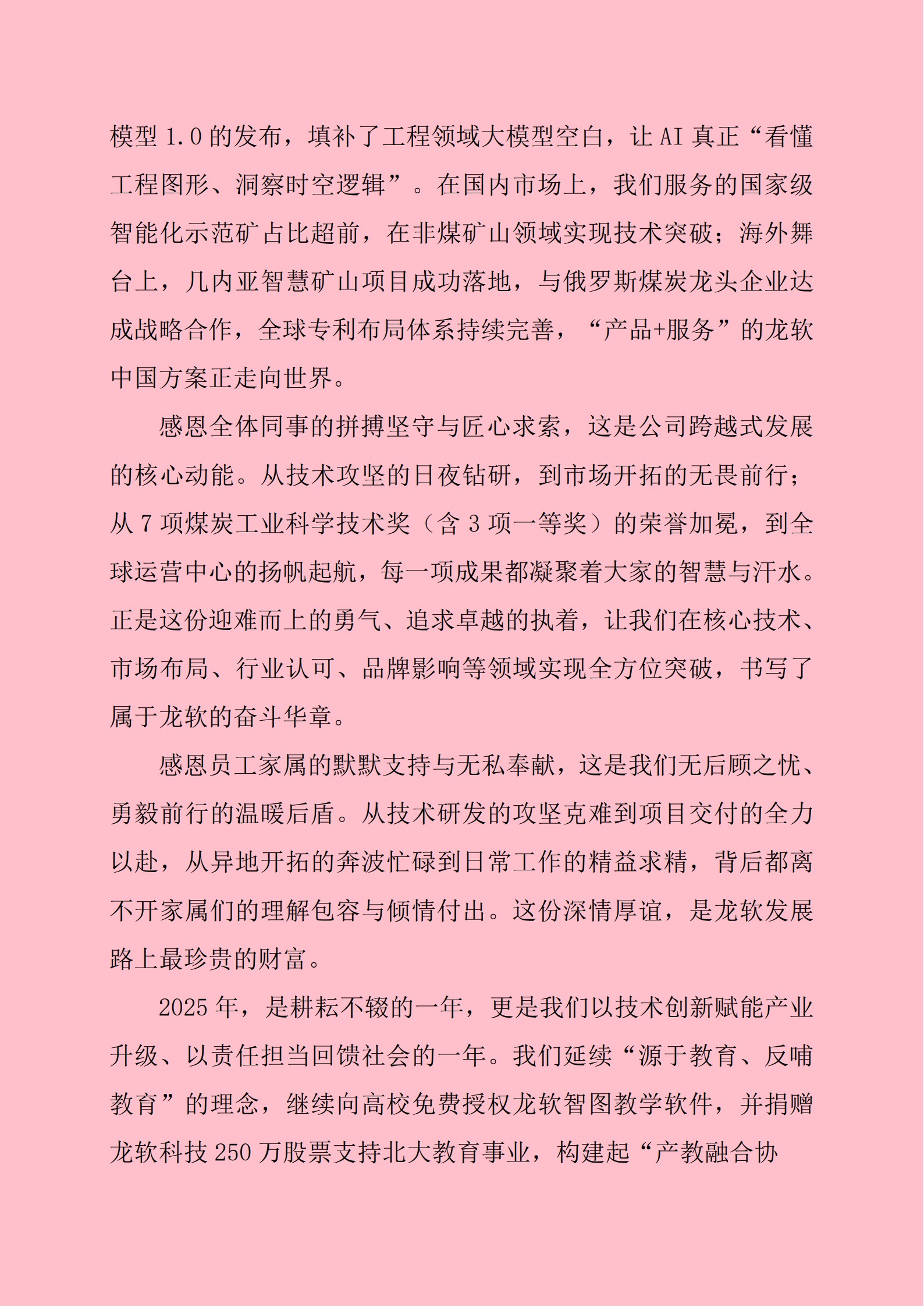 2025年1月,第十二屆北京大學(xué)地球與空間科學(xué)學(xué)院“龍軟科技”獎(jiǎng)教金頒獎(jiǎng)典禮順利舉行,公司延續(xù)12年捐贈(zèng)傳統(tǒng),本年度出資獎(jiǎng)勵(lì)10名優(yōu)秀教師與56名碩士、博士研究生,累計(jì)已資助62位教師及484名學(xué)子。針對(duì)行業(yè)人才需求,公司在原有獎(jiǎng)學(xué)金基礎(chǔ)上,聯(lián)合中國礦業(yè)大學(xué)(北京)教育基金會(huì)優(yōu)化“龍軟科技智慧礦山優(yōu)秀學(xué)生獎(jiǎng)學(xué)金”,增設(shè)“卓越獎(jiǎng)學(xué)金”類別,覆蓋智能采礦、人工智能等11個(gè)核心專業(yè),其中10名獲卓越獎(jiǎng)學(xué)金的學(xué)生已通過企業(yè)實(shí)習(xí)考核獲得優(yōu)先錄用資格。