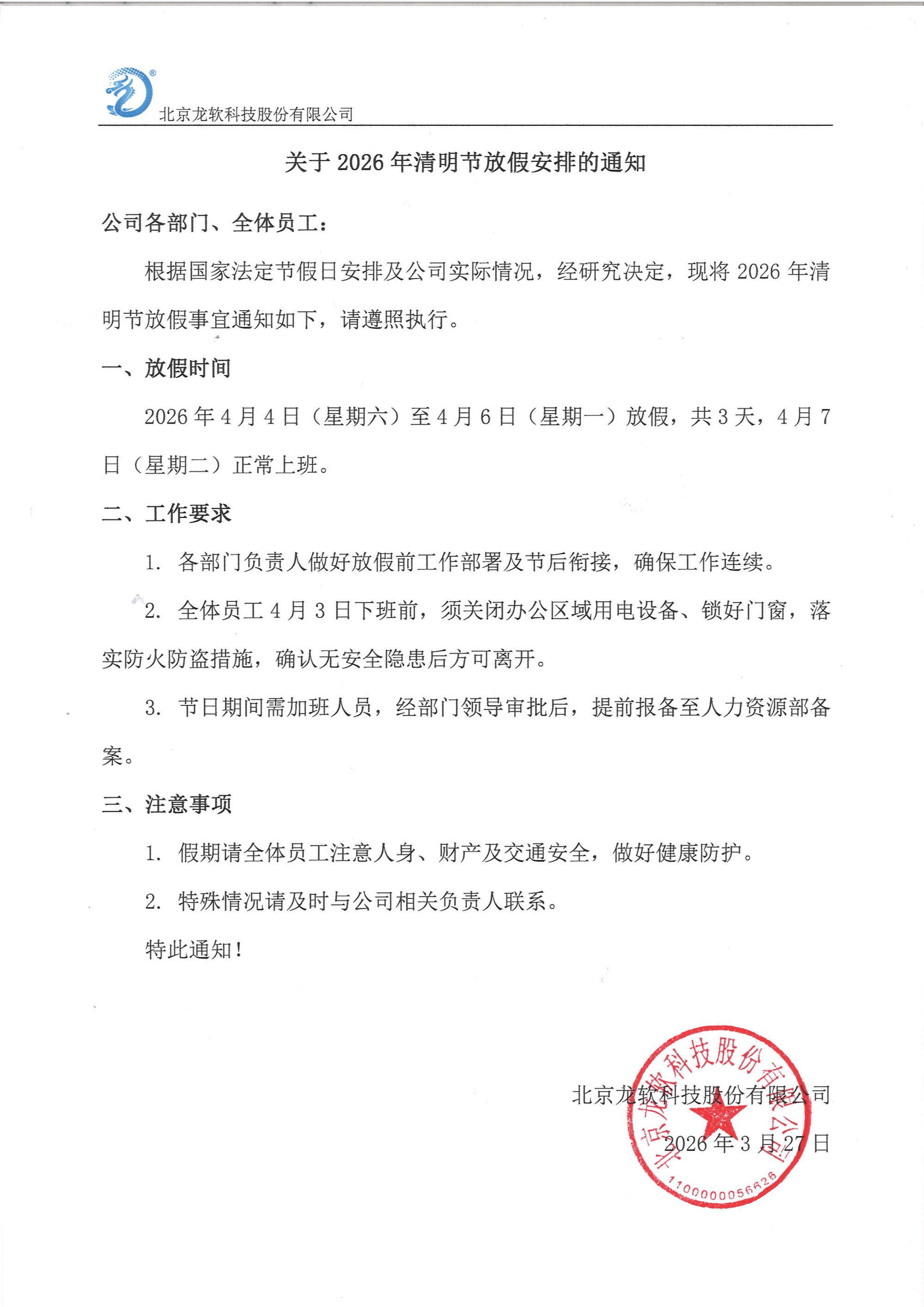 關于2026年清明節放假安排的通知